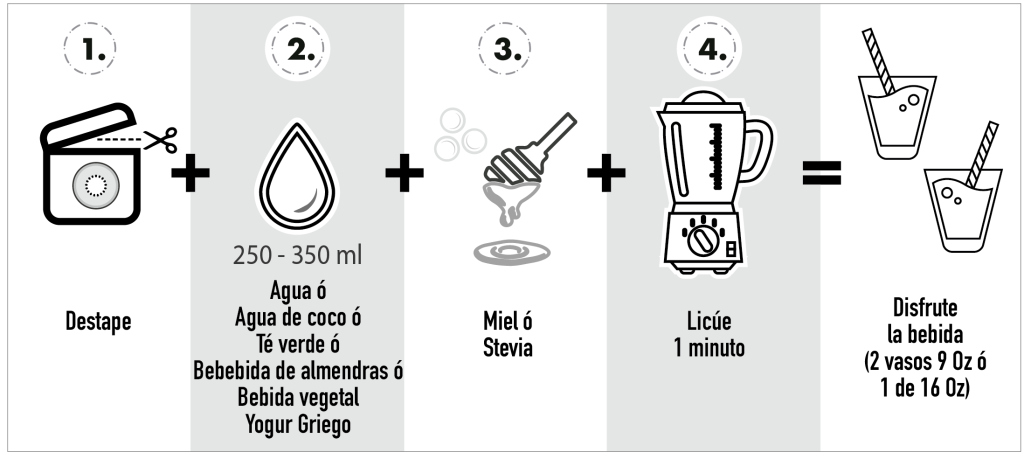 Solo tienes que poner los ingredientes en la licuadora 1 minuto con un pocillo de agua o té verde (250 mL) y listo, a disfrutar la bebida. RINDE HASTA MEDIO LITRO.