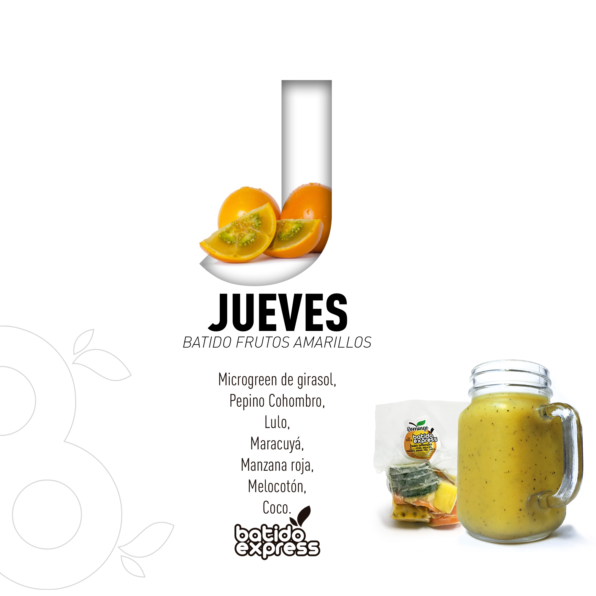 jueves: manzana roja, lulo, maracuyá, pepino cohombro, durazno melocotón, coco,  microgreens girasol;