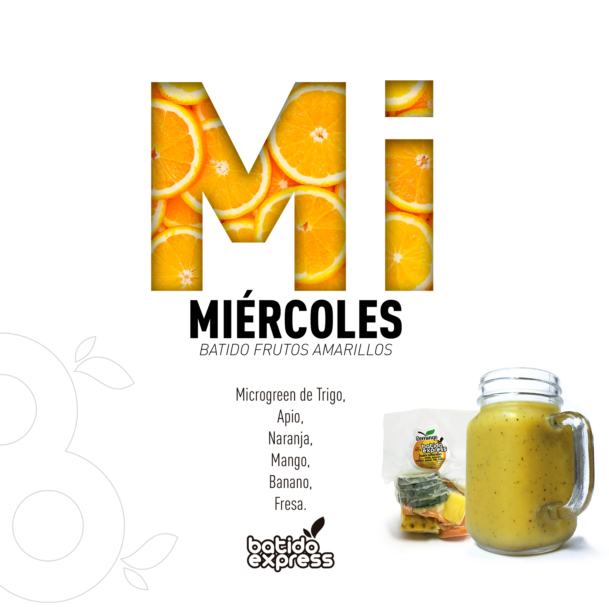 miércoles: fresa, naranja, apio, mango, banano,  microgreens trigo;