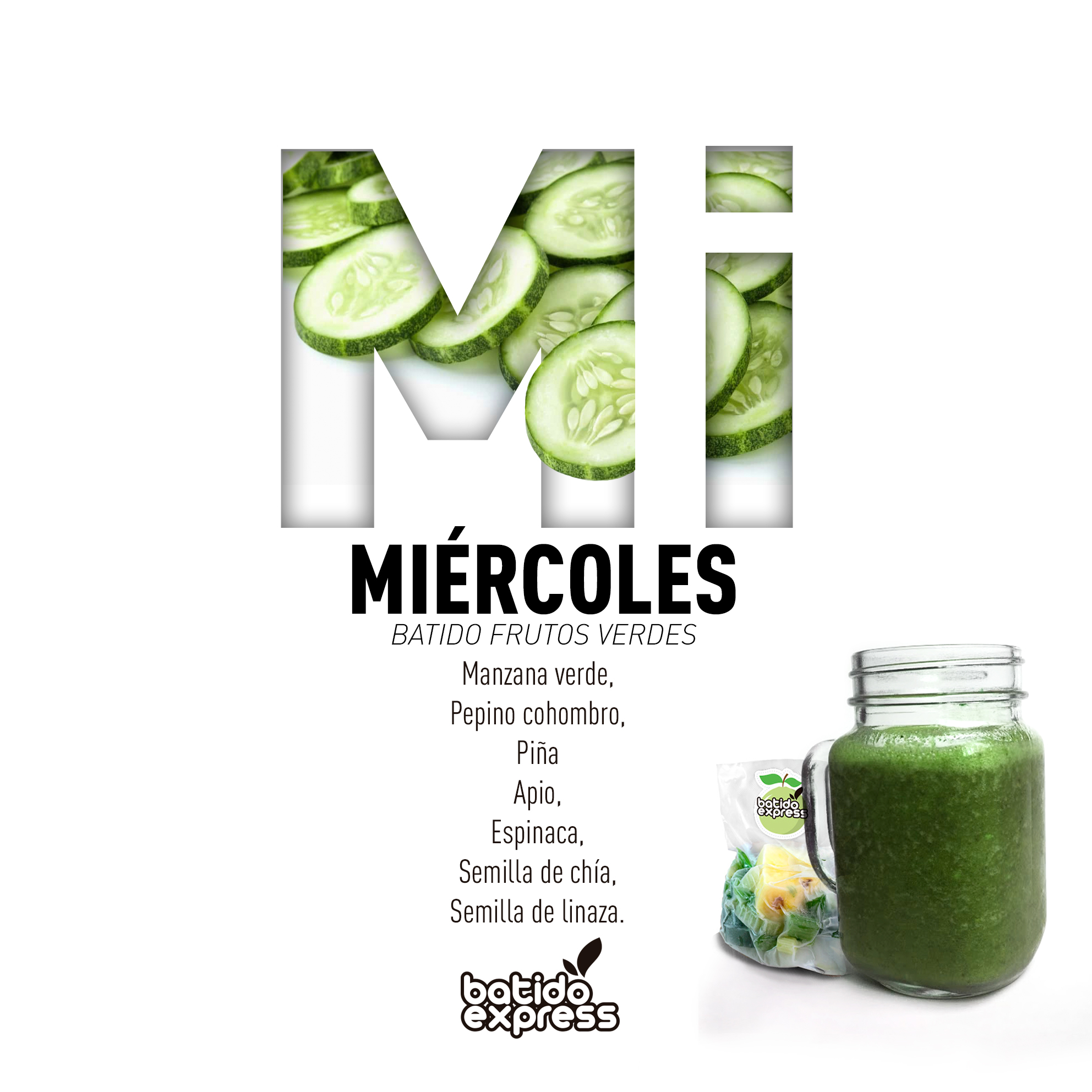 miércoles: manzana verde, pepino cohombro, piña, apio, espinaca, chía, linaza;